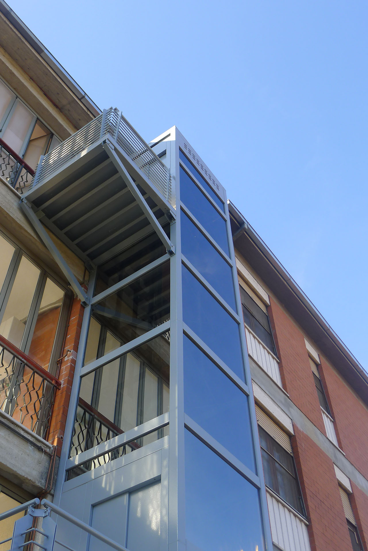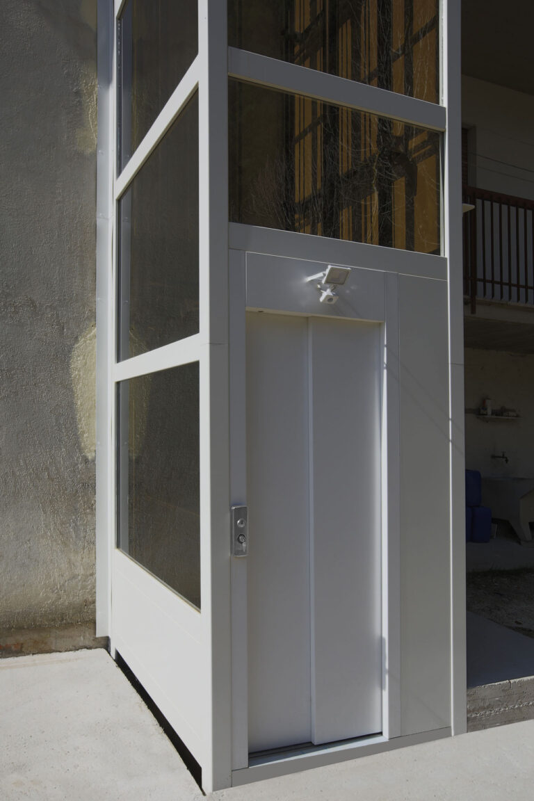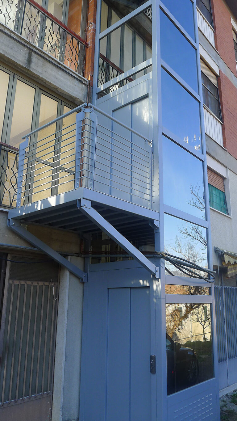 Ascensore domestico inserito in struttura metallica personalizzata e modulare dotata di ballatoi di sbarco ai terrazzi.
