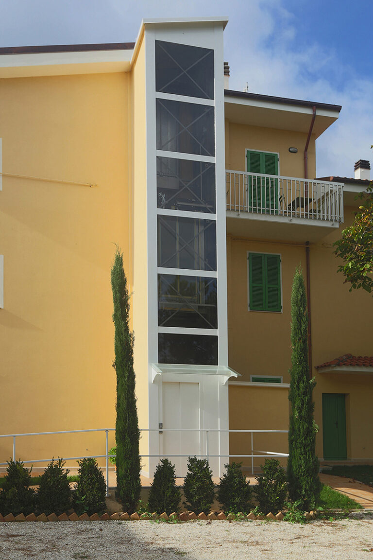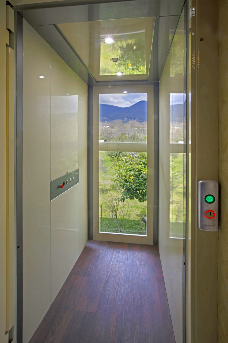 Piattaforma elevatrice in azienda agricola. Colori pastello in linea con il contesto. Pareti in vetro per una incantevole veduta del panorama circostante.