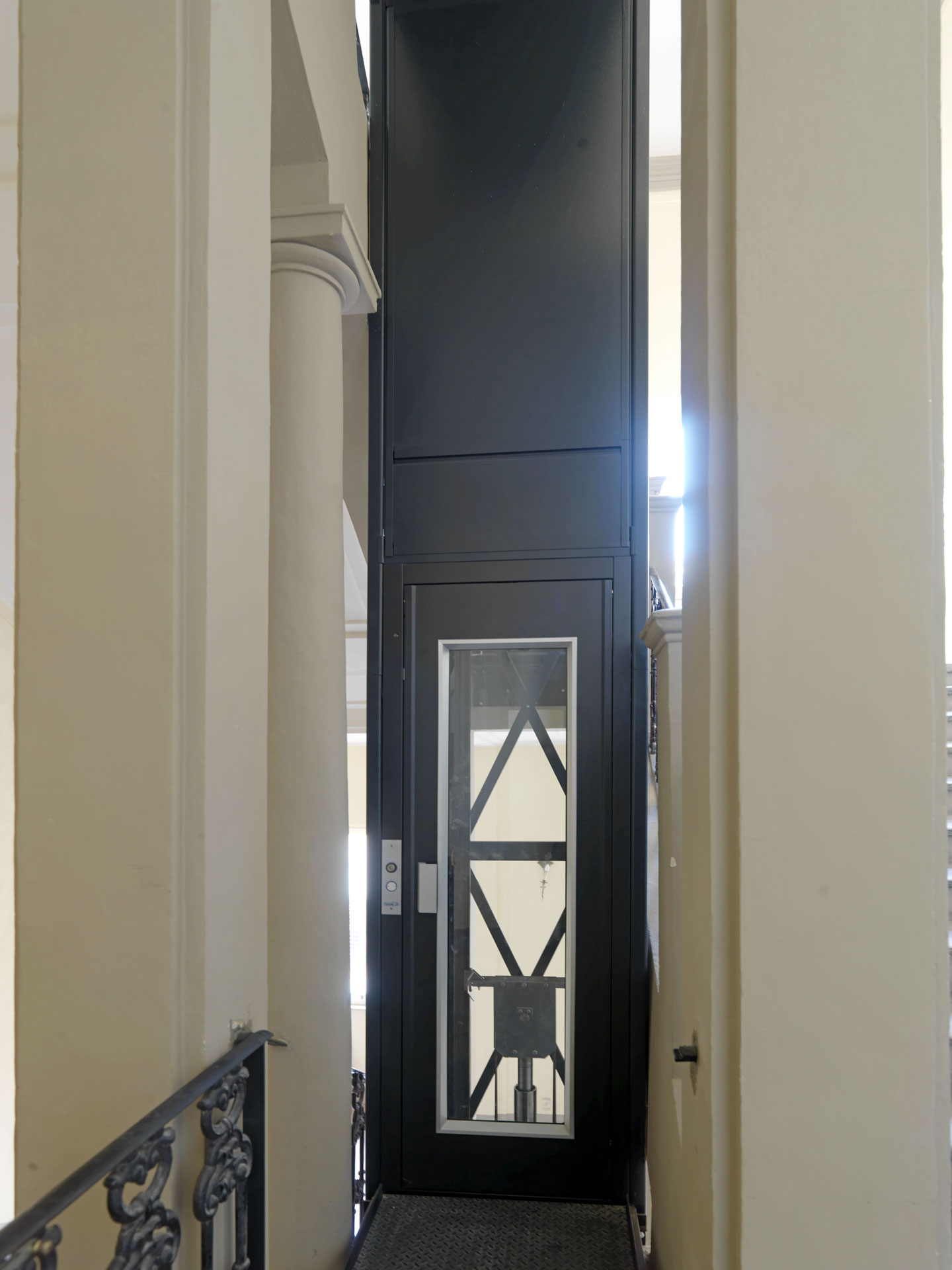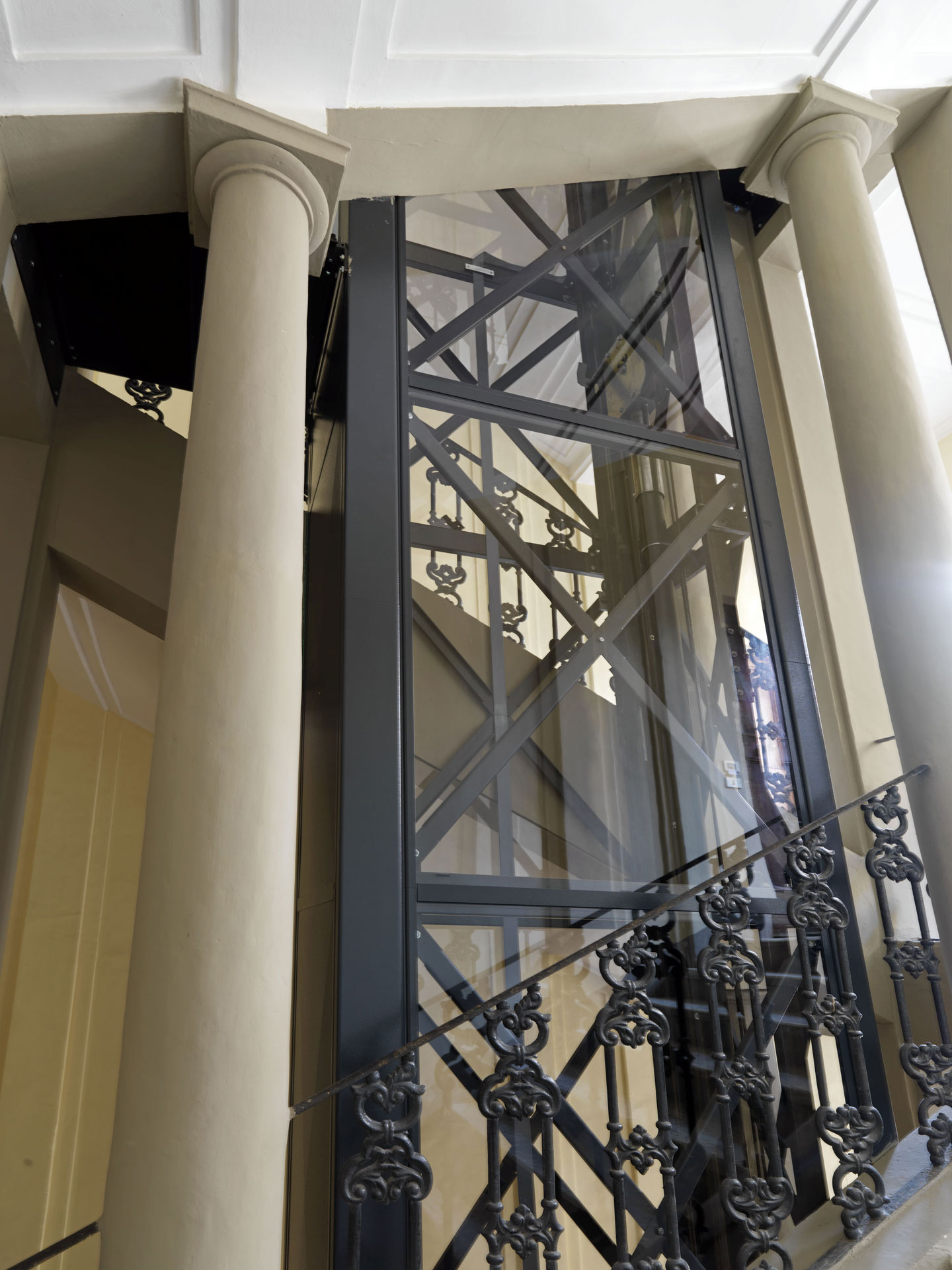 Piattaforma elevatrice in edifico storico sprovvisto di impianto elevatore. Ricercato progetto per una perfetta sinergia tra antico e moderno.
