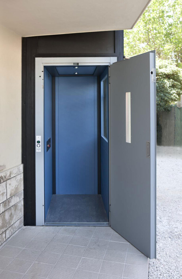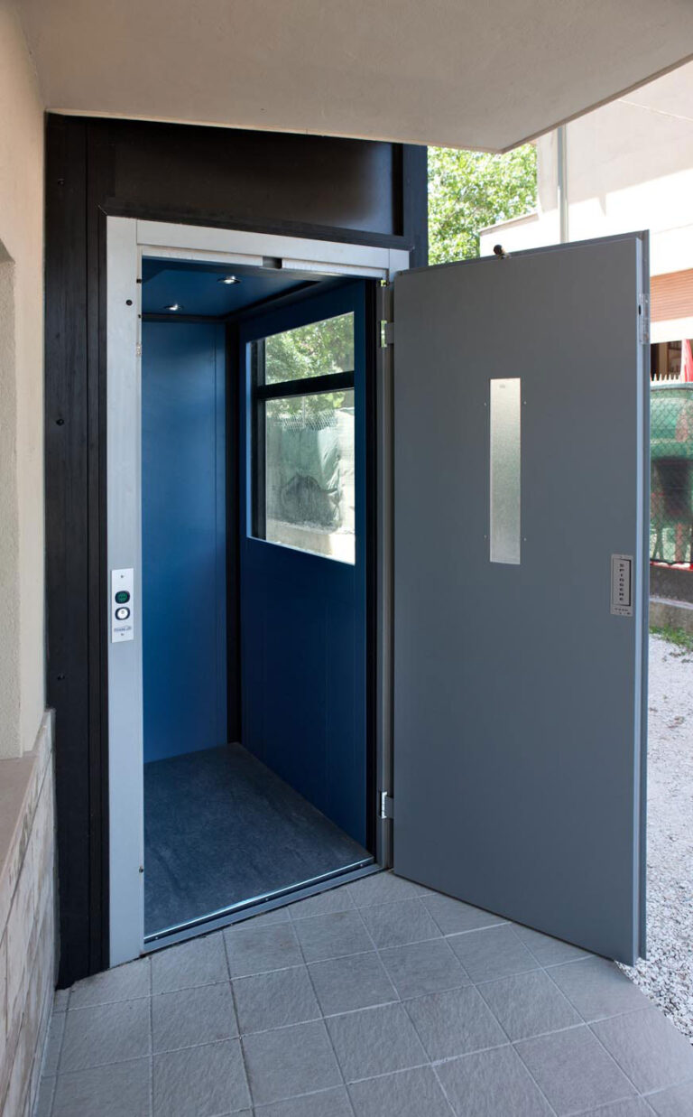 Piattaforma Elevatrice in condominio a Senigallia. Installazione esterna al fabbricato. Sbarchi fermate di piano ai terrazzi.