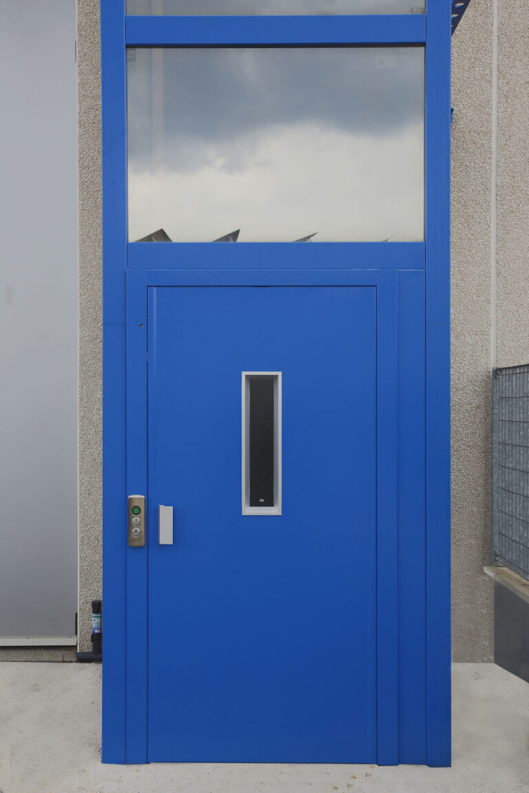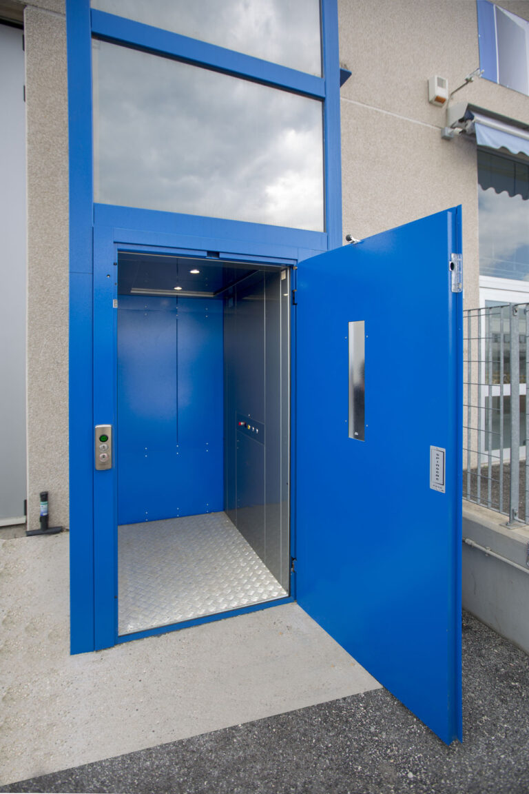 Piattaforma elevatrice in attività commerciale e struttura metallica esterna. Personalizzazione dei colori in continuità con la facciata dello stabile.